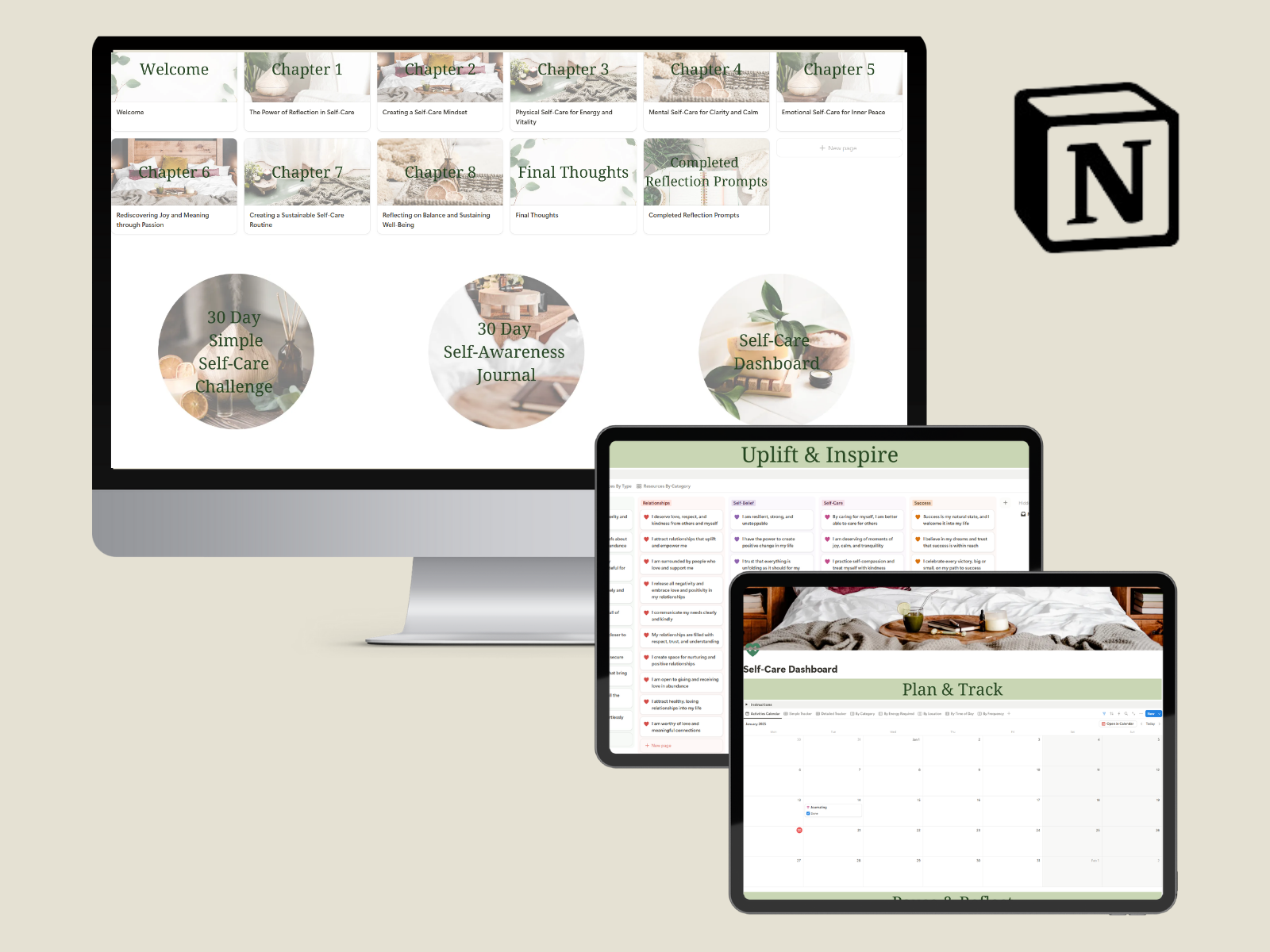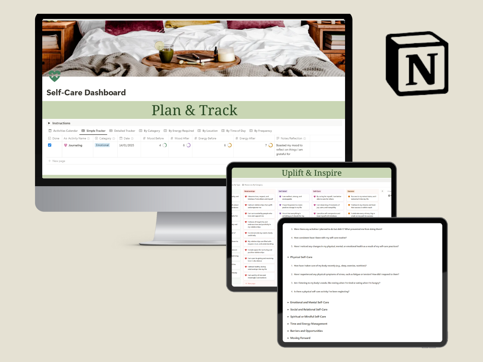 You can access the Self-Care Guide, 30-Day Challenge, and Self-Awareness Journal without a Notion account, as these can be read as standalone resources. However, to fully engage with the interactive features—such as journaling, tracking, and customising your experience—a free Notion account is recommended. The Self-Care Dashboard is fully interactive and works best within Notion.