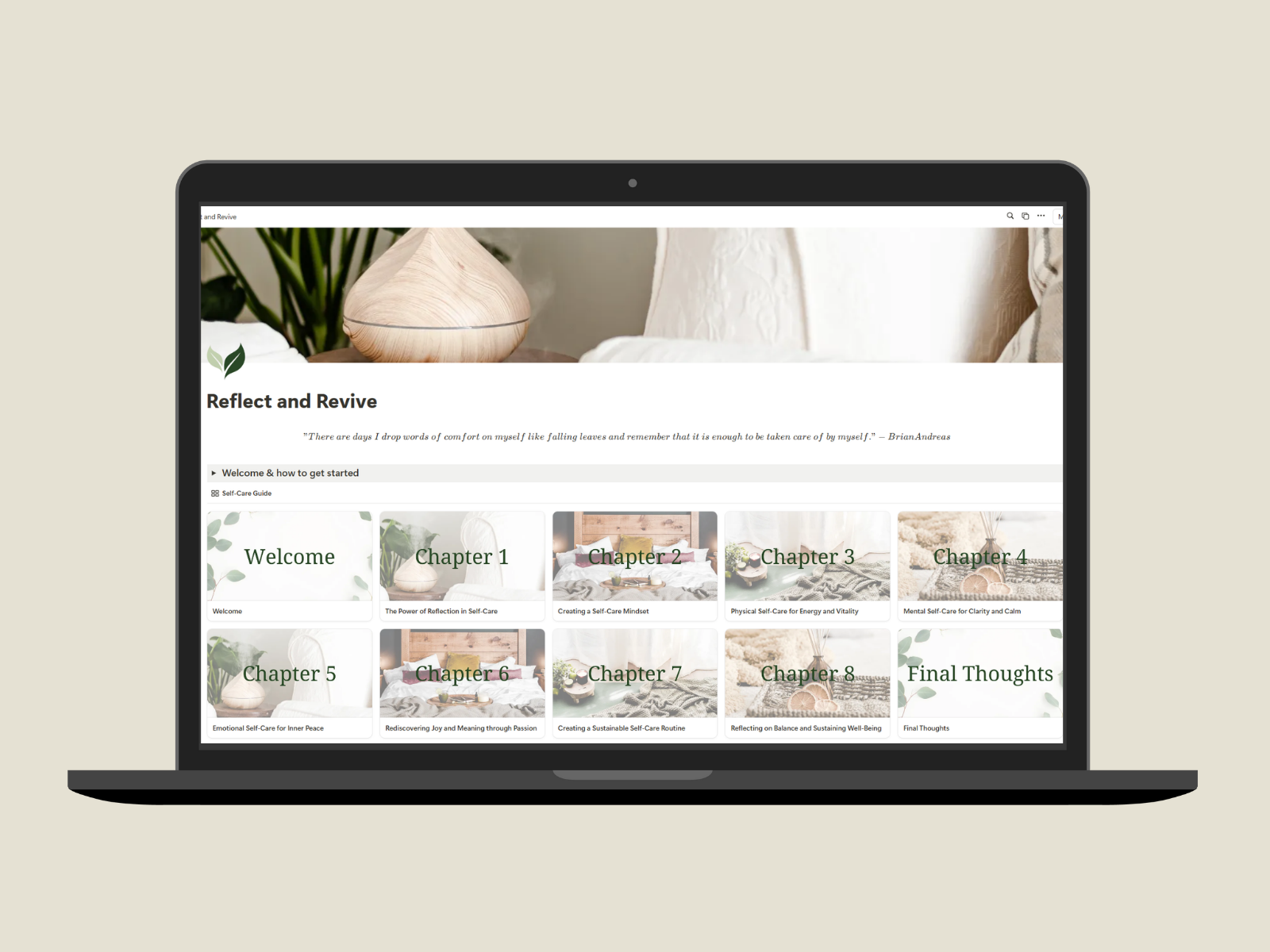 Most self-care advice tells you what to do—but not how to actually make it part of your life. Reflect & Revive helps you move past the cycle of trying and stopping by giving you structured guidance, self-awareness tools, and a space to track what actually works for you. It’s about building a self-care practice that feels effortless, not forced.